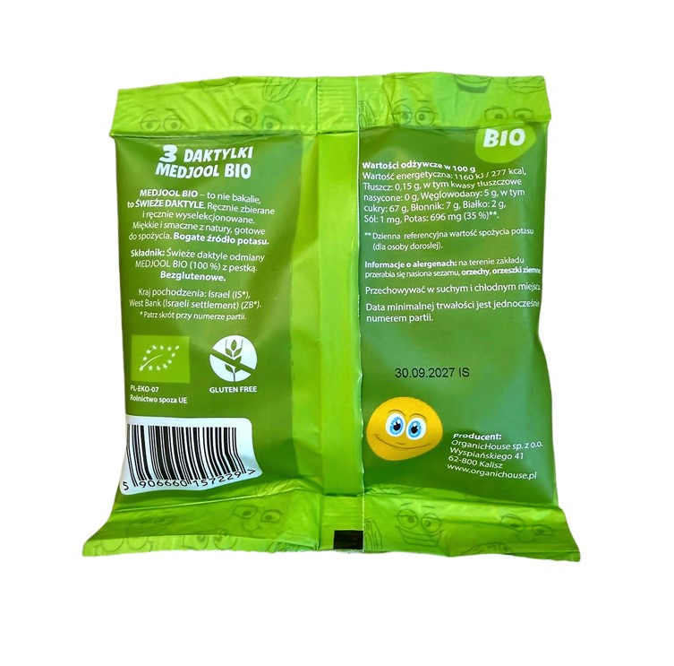 TRZY sztuki najwyższej jakości, ręcznie zbieranych i ręcznie wyselekcjonowanych świeżych daktylo odmiany MEDJOOL BIO w rozmiarze large (18-24 g/ szt.) zapakowane w saszetce. Bezglutenowe, czyste gotowe do spożycia. Masa opakowania min. 50 g